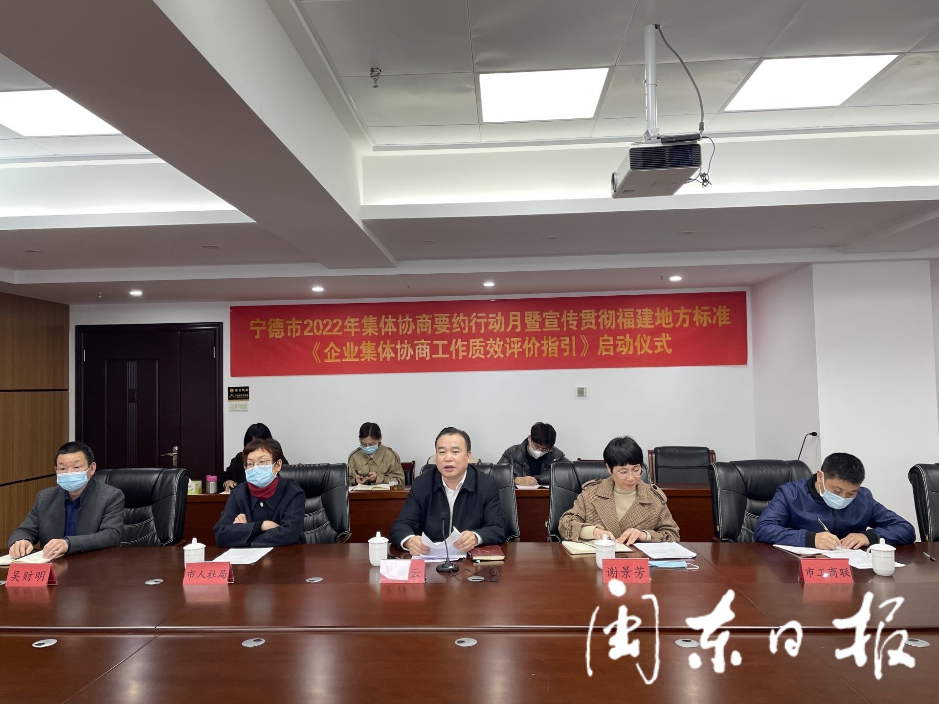 3月25日下午,宁德市2022年集体协商要约行动月暨宣传贯彻福建地方标准《企业集体协商工作质效评价指引》启动活动举行,部署全市集体协商工作,同时通过“云观摩”福建盈浩文化创意股份有限公司“能级工资”集体协商现场,推动新出台的企业集体协商福建地方标准落实落地。