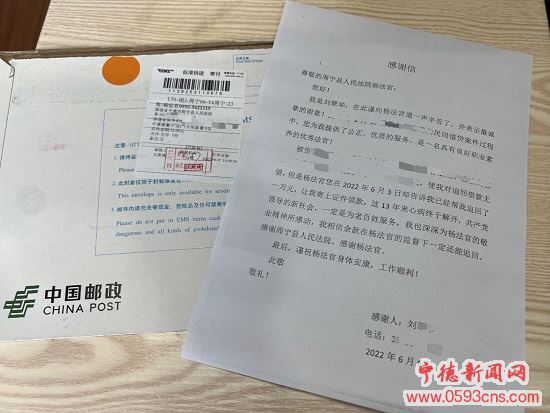 宁德新闻网6月15日电 (杨文峰)“感谢杨法官为我提供了公正、优质的服务,帮我追回了1万元……这13年来的心病终于解开。”近日,宁德市周宁县人民法院在发放一笔民间借贷纠纷案的执行案款后,收到一封从南平市的六旬老人刘某寄来的感谢信。