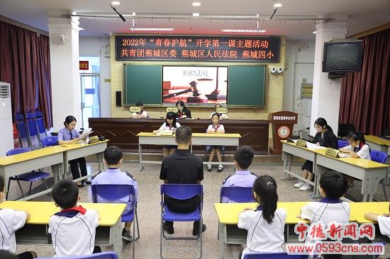 宁德新闻网9月20日电 (陈亚男)“现在开庭……”随着一声清脆的法槌声响,“被告人”在两名“法警”的引导下,缓缓走到被告席……近日,宁德蕉城法院组织干警前往蕉城区第四中心小学开展“青春护航”开学第一课主题活动。