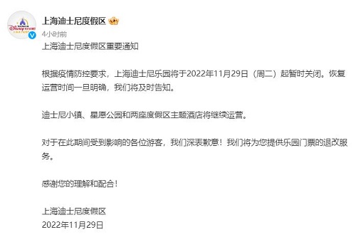 中新网11月29日电 据@上海迪士尼度假区 29日消息,根据疫情防控要求,上海迪士尼乐园将于2022年11月29日(周二)起暂时关闭。迪士尼小镇、星愿公园和两座度假区主题酒店将继续运营。对于在此期间受到影响的游客,上海迪士尼度假区将提供乐园门票的退改服务。(中新财经)