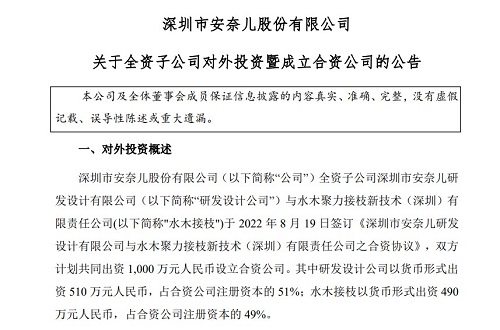 8月22日,安奈儿披露《关于全资子公司对外投资暨成立合资公司的公告》。