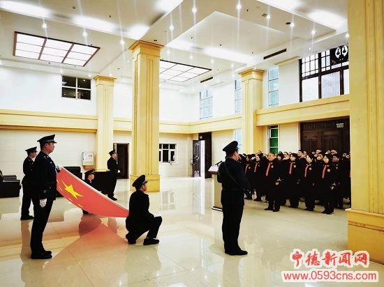 在福鼎市法院,福鼎法院全体员额法官身着法袍,举起右手、面向国旗庄严宣誓,展现对弘扬宪法精神、维护宪法权威的庄严承诺。