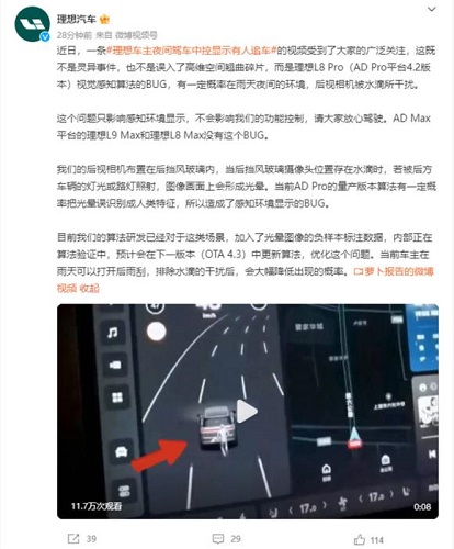 中新网1月16日电 近日,一条“理想车主夜间驾车中控显示有人追车”视频受到关注。16日,理想汽车官方微博作出回应,称上述现象是理想L8 Pro(AD Pro平台4.2版本)视觉感知算法的BUG。
