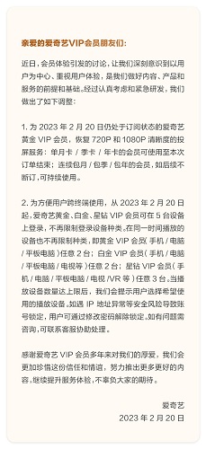 2月20日,针对会员投屏被限制清晰度和登录设备数量一事,爱奇艺称,爱奇艺黄金、白金、星钻VIP会员可在5台设备上登录,不再限制登录设备种类。对仍处于订阅状态的爱奇艺黄金VIP会员,恢复720P和1080P清晰度的投屏服务。
