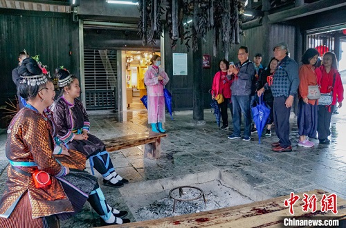 5月7日,台湾花莲县客家乡村振兴农商交流参访团在桂林阳朔山水旅游开发有限公司(又称世外桃源景区)欣赏侗族大歌。 中新社发 蒋丰慧 摄