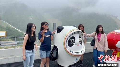 7月29日,海外台胞青年在冬奥村“打卡”冰墩墩。中新社记者 张杨彬 摄