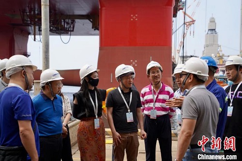 8月22日,二十余位台湾教师到访烟台中集来福士海洋工程有限公司。中新社记者 张杨彬 摄