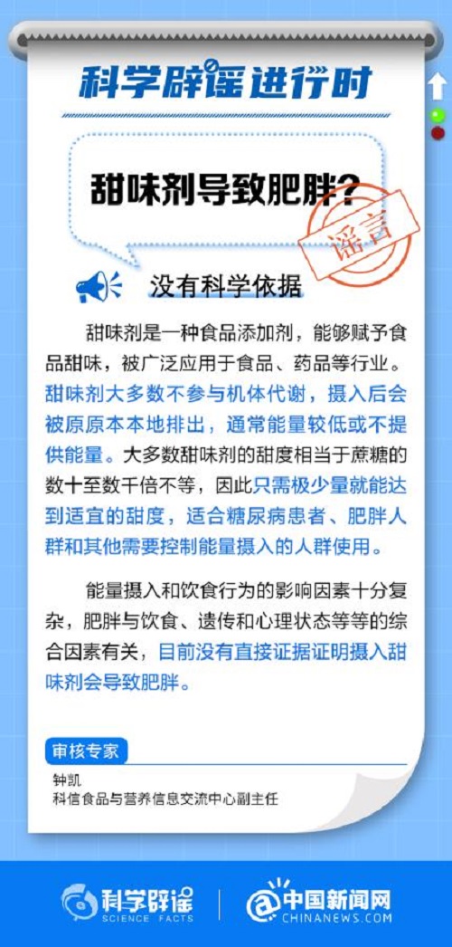 中新网9月15日电 甜味剂大多数不参与机体代谢,摄入后会被原原本本地排出,通常能量较低或不提供能量。能量摄入和饮食行为的影响因素十分复杂,肥胖与饮食、遗传和心理状态等等的综合因素有关,目前没有直接证据证明摄入甜味剂会导致肥胖。(来源:@科学辟谣 中国新闻网微博 )