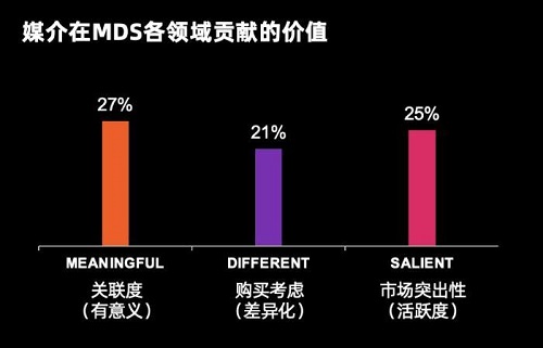 具体到凯度BrandZ MDS品牌力资产研究框架模型中,媒介投放对品牌关联度和活跃度影响最大,分别为27%和25%——说明媒介投放是维系品牌与消费者关系的重要介质,是提升品牌资产和品牌价值的重要方式。