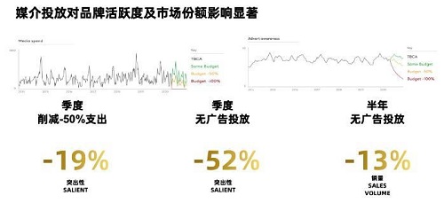 酒香也怕巷子深,再好的品牌和产品,也必须以“广而告之”的传播形式触达最广泛的消费者,才能让品牌与产品的意义突显,并且在消费者心中保持活跃,成为购买首选。凯度研究表明,当一个季度的媒介预算减少50%,那么品牌活跃度减少19%;当一个季度0投放的时候,品牌活跃度将下降52%。当一个品牌半年不投广告的时候,直接影响销量下降13%。这就是品牌建设、媒介投放对于企业增长的影响力。