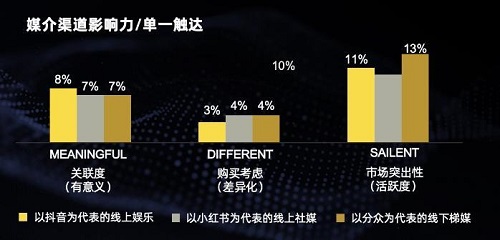 凯度BrandZ研究也进一步证明,不同媒介渠道对品牌资产三个方面的影响力不同。在“有意义”方面,抖音为代表的线上娱乐渠道的影响较大,为8%。在“差异化”方面,以小红书为代表的线上社媒、以分众为代表的线下梯媒的影响力较高,均为4%。在“活跃度”方面,以分众为代表的线下梯媒以13%的影响力,排名第一。以分众为代表的线下梯媒具有更高的广告接受度,因此也比其他媒介更能有力提升品牌活跃度。