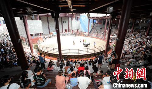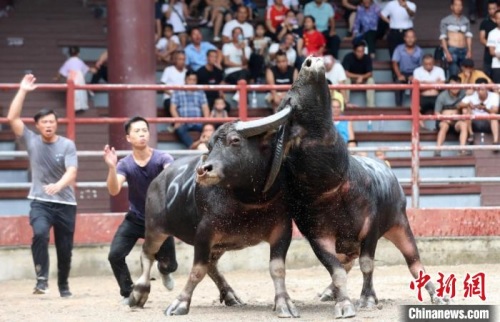 10月1日,广西三江侗族自治县月也侗寨景区举行超级牛王争霸赛,来自广西、贵州等地的8头牛王同台竞技、激烈对决。图为比赛现场。 龚普康 摄