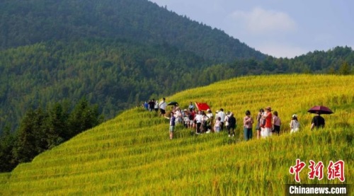 10月2日,国庆假期,中外游客穿梭在广西桂林市龙胜县龙脊梯田景区欣赏美景。近期,龙脊梯田进入一年最佳观赏季节。 杨宗盛 摄
