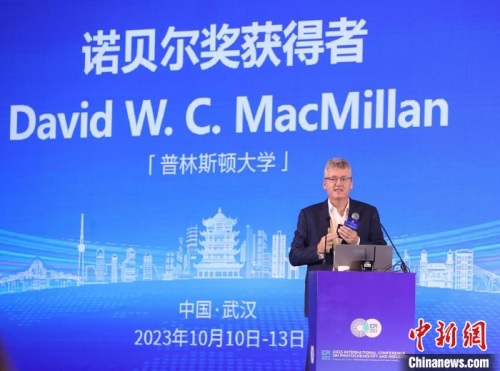 10月11日,2021年诺贝尔化学奖获得者戴维·麦克米伦(David W. C. MacMillan)在2023年国际光化学技术与产业大会上发言。 张畅 摄