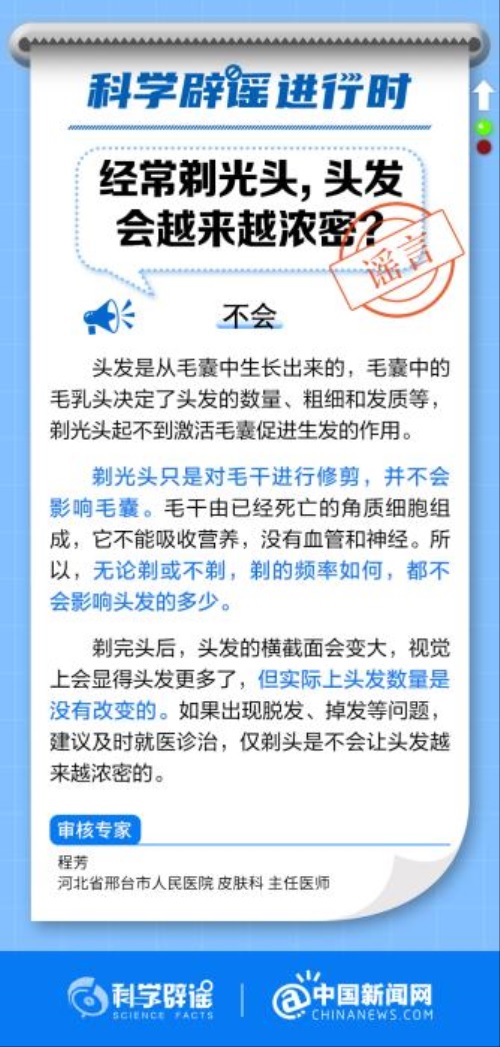 中新网10月18日电 头发是从毛囊中生长出来的,毛囊中的毛乳头决定了头发的数量、粗细和发质等,剃光头起不到激活毛囊促进生发的作用,无论剃或不剃,剃的频率如何,都不会影响头发的多少。如果出现脱发、掉发等问题,建议及时就医诊治。(来源:@科学辟谣 @中国新闻网 )