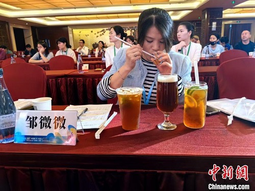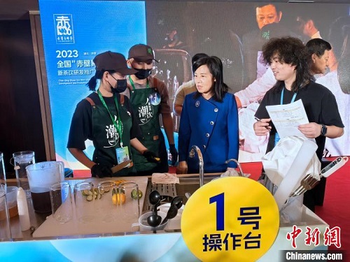 中新网湖北赤壁10月25日电(胡传林 童金健 但唐静) 2023全国“赤壁青(米)砖茶+”新茶饮研发推广邀请赛25日在湖北赤壁开赛,来自全国各地的24家茶饮品牌及茶企组队参赛。