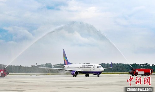 乌鲁木齐航空顺利首航广东湛江,湛江机场公司在机场停机坪举办了一场“过水门”的欢迎活动。湛江机场 供图