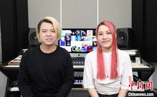 2月16日,来自台湾台北的“夫妻档”电音组合黄杰妮(右)和李仕翔(左)接受采访。 中新社记者 张亨伟 摄
