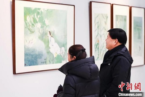 参观者驻足欣赏谭小平画作。余岁柏 摄
