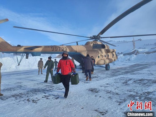新疆军区某陆航旅在此次雪崩救援任务中共计飞行23架次,投送各类救援物资14.3吨,转运救援人员和群众百余人。(姬建涛 摄)