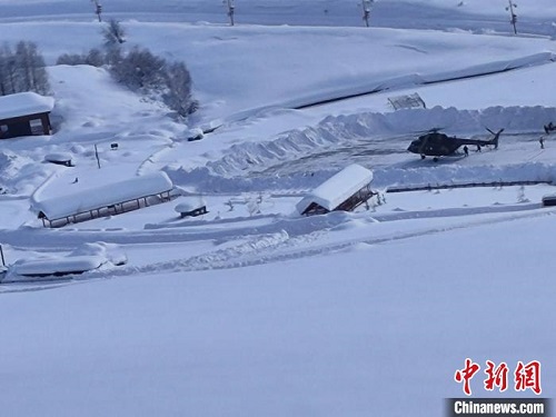 连日来的强降雪导致阿勒泰山区喀纳斯景区禾木村通往外界的道路出现多处雪崩,道路阻塞,造成游客滞留景区。由于雪崩路段积雪厚度达到5米,地面救援速度缓慢。新疆军区某陆航旅派出两架运输直升机向受灾点位投送急缺物资并转移部分伤病员。