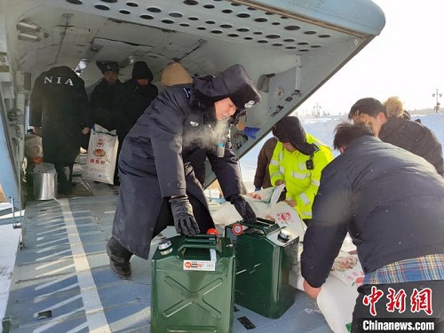 直升机飞抵禾木上空盘旋,寻找最佳降落点位,最终选择在禾木村一座停车场降落卸载。飞机降落吹起巨大的风雪,为防止转运的药品、蔬菜、鸡蛋等物资冻坏,当地民警和村干部迅速上前协助官兵卸载物资。随后,官兵和民警协同配合,引导受困游客有序登机。半小时后,救援机组顺利降落喀纳斯机场,机组官兵迅速补充油料。紧接着,第二批次投送转运任务相继展开。