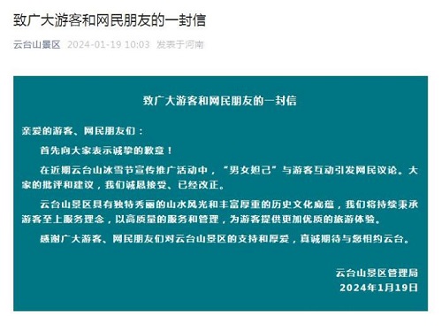 中新网1月19日电 据云台山景区微信公众号消息,云台山景区管理局19日发布致广大游客和网民朋友的一封信,就“男女妲己”与游客互动致歉。