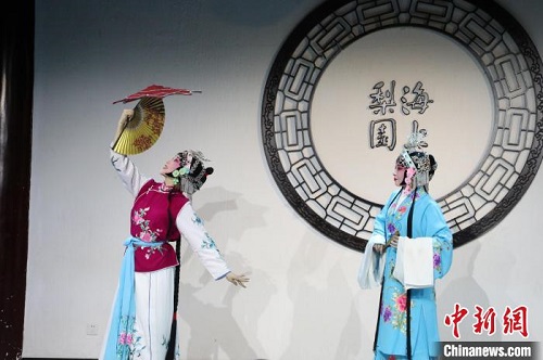 图为李树建与其“洋弟子”刘黄河在上海豫园“海上梨园”同台演出。 记者李贵刚 摄