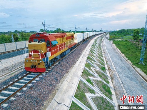 资料图为2023年6月,中老铁路“洪九泰好吃”榴莲专列在老挝发运。(重庆洪九果品股份有限公司供图)