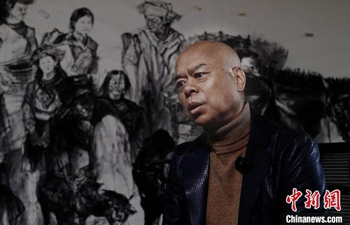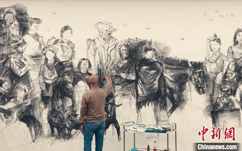 中新网昆明1月26日电 (缪超 陈雪莲)着墨,挥毫,画家罗江正在潜心创作云南26个民族的群像图。在高逾3米、长逾8米的画纸上,众多民族人物神态各异,栩栩如生。其中,一名彝族老妇的形象格外引人注目,披着羊毛毡,蹲坐地上,脸庞的褶皱写满沧桑,但她的眼神里却毫无焦虑,充满坚定,无声地传递出一种“苦涩的美感”。